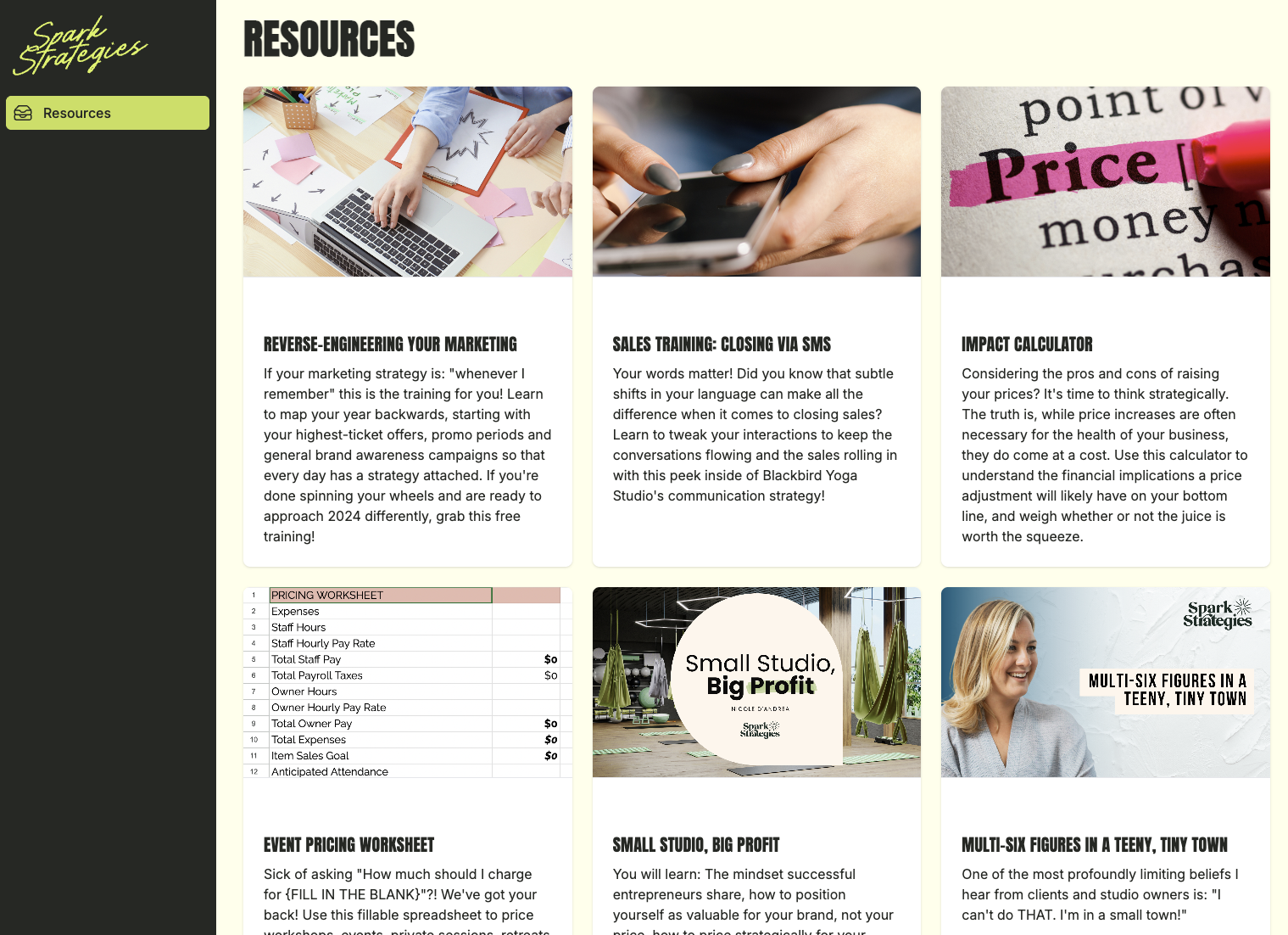 Spark Strategies was built from a deep need for professionalization in the industry we love the most. We believe that every female entrepreneur deserves the knowledge and tools required to run a business that not only survives - but thrives! Inside this library, you'll find the very best of what we know about running a boutique studio business. The best part? It's on us.